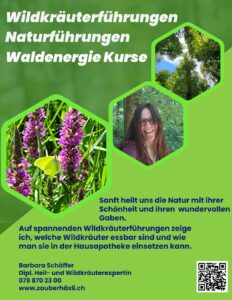 In den Naturführungen tauchen wir tiefer in die Pflanzenwelt ein und befassen uns mit verschiedenen Wildkräutern. Vielleicht findest auch du deine Seelenpflanze. Du lernst die Wildkräuter und deren Inhaltsstoffe kennen, erfährst von den Geheimnissen und dem Wesen der Pflanzen und weisst nachher, wie du zu Hause selbst ein Kräuteröl herstellen und dieses dann auch zu einer Salbe verarbeiten kannst. Auch in der Kulinarik lassen sich unsere Wildkräuter sehr vielseitig verwenden.